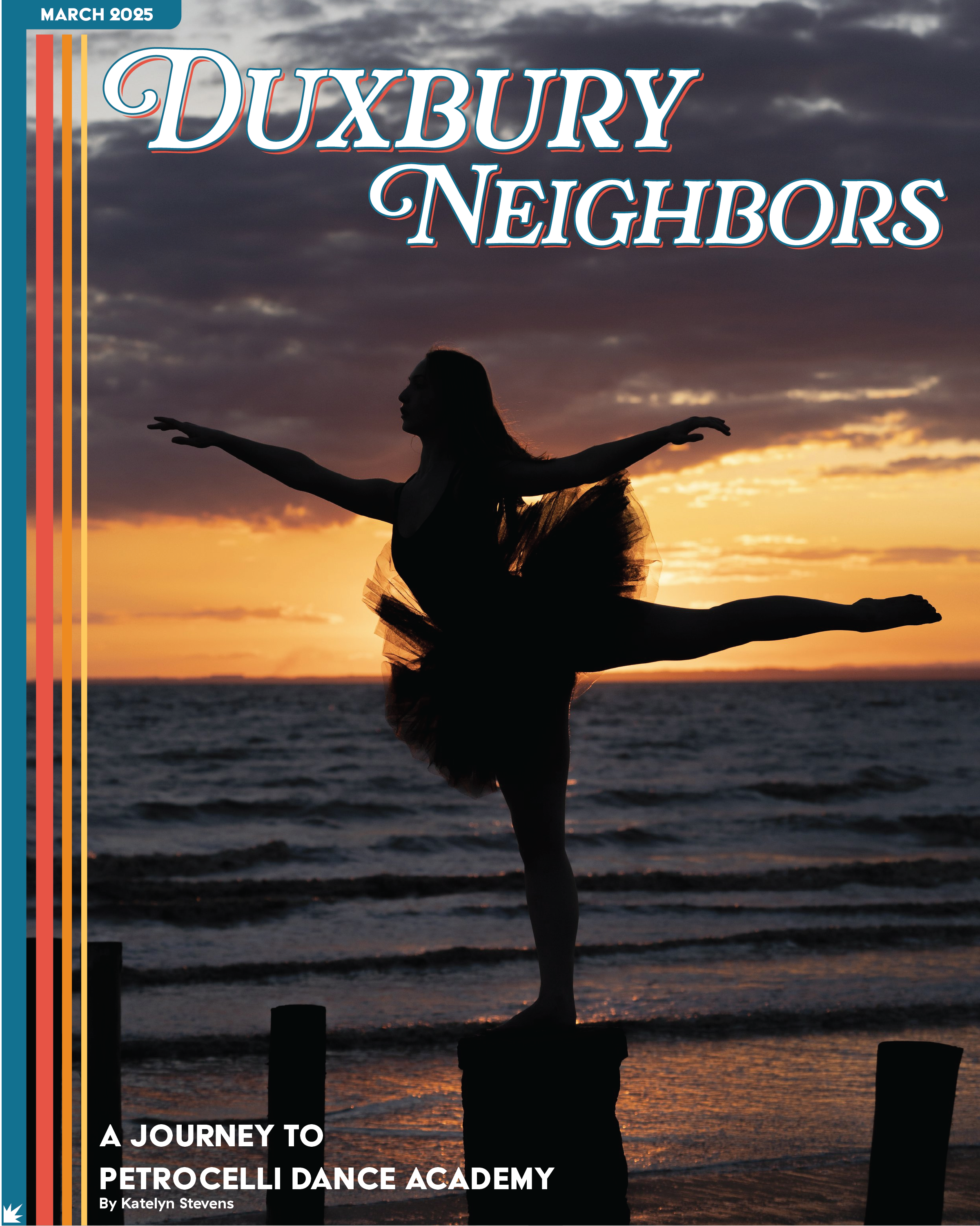 The stripes on the side of the cover design are meant to represent the Powder Point Bridge, a Duxbury landmark. The colors were inspired by a bright sunset, they are carried throughout the rest of the piece.